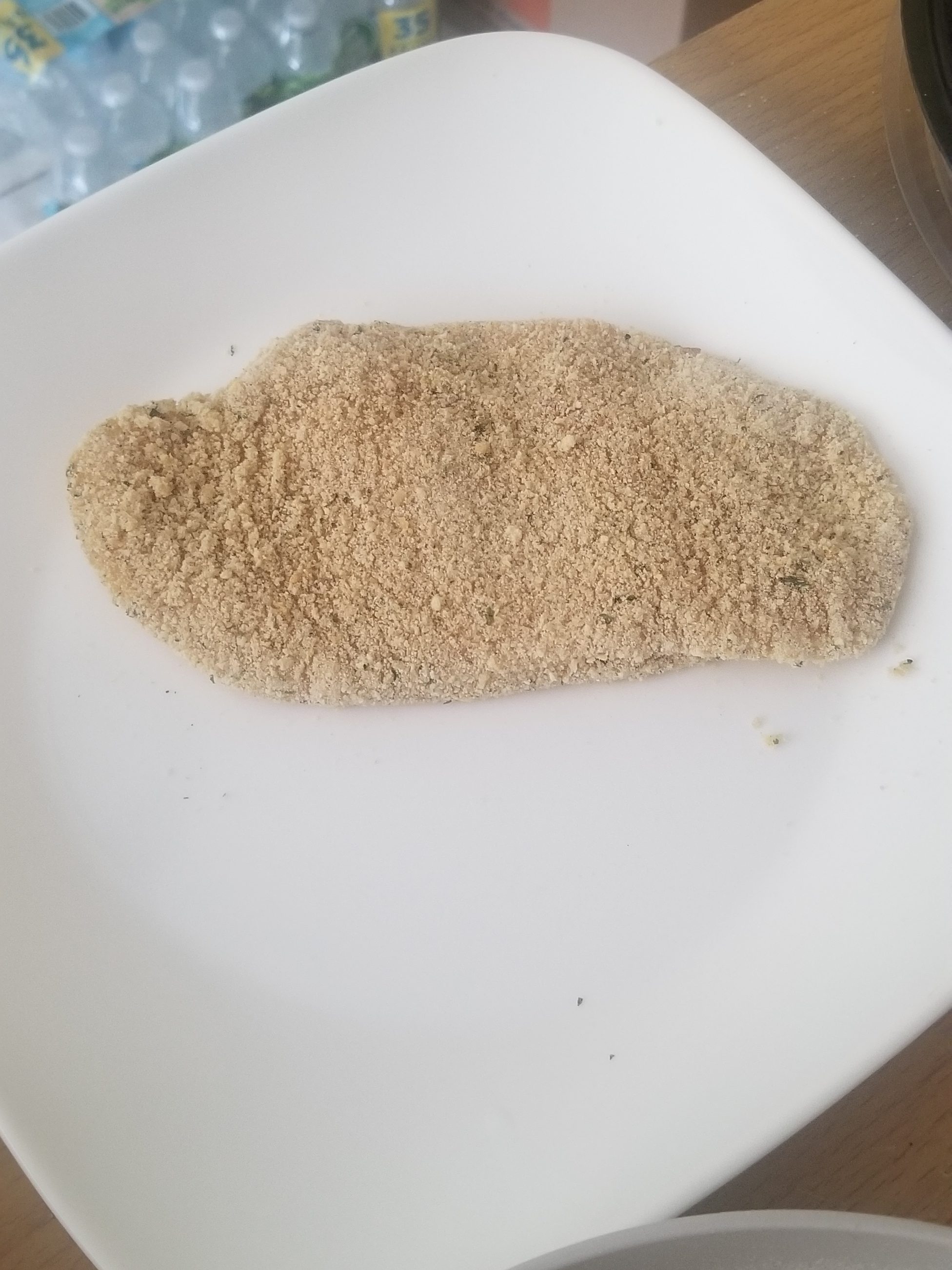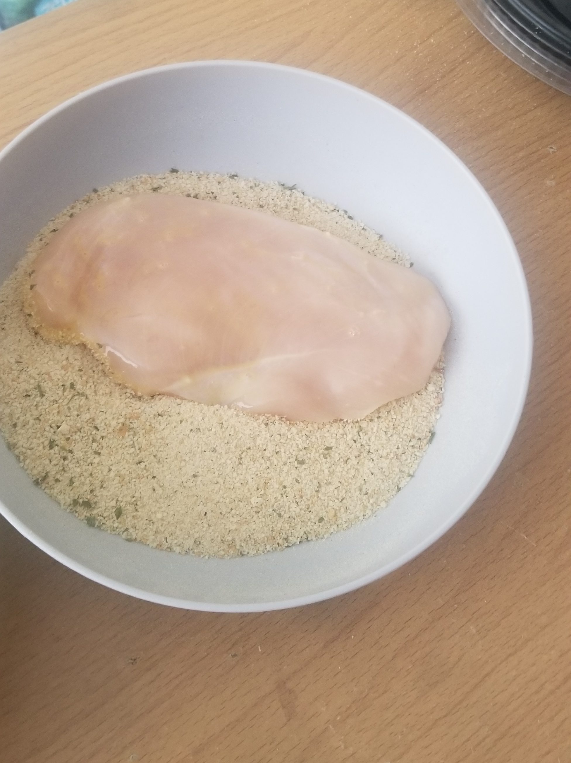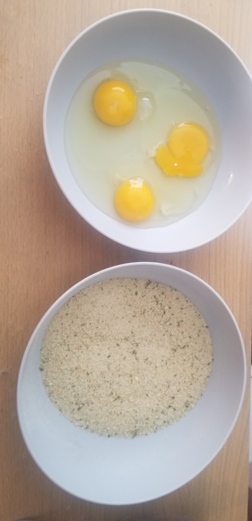 While the asparagus is cooking I start preparing the chicken. I take all the chicken breasts and cut them in half. This makes them easier to cook and you get more cutlets.